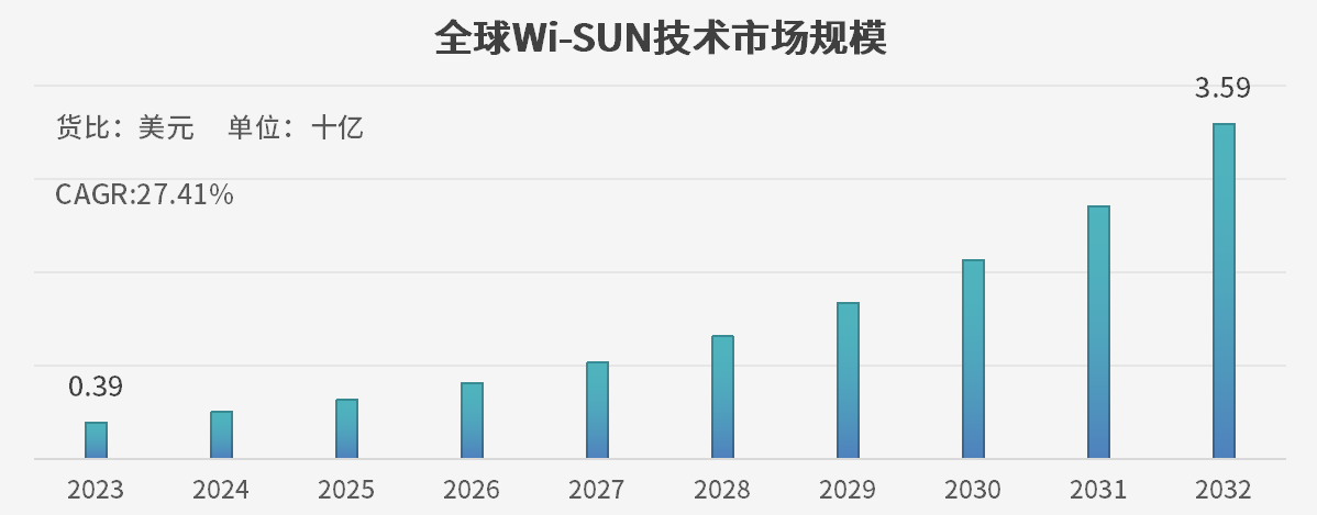 据business research insights公布数据显示,2023年全球Wi-Sun技术市场规模已达3.9亿美元,预计到2032年,全球Wi-Sun市场规模将达到35.9亿美元,预测期内复合年增长率为27.41%,市场前景持续向好。