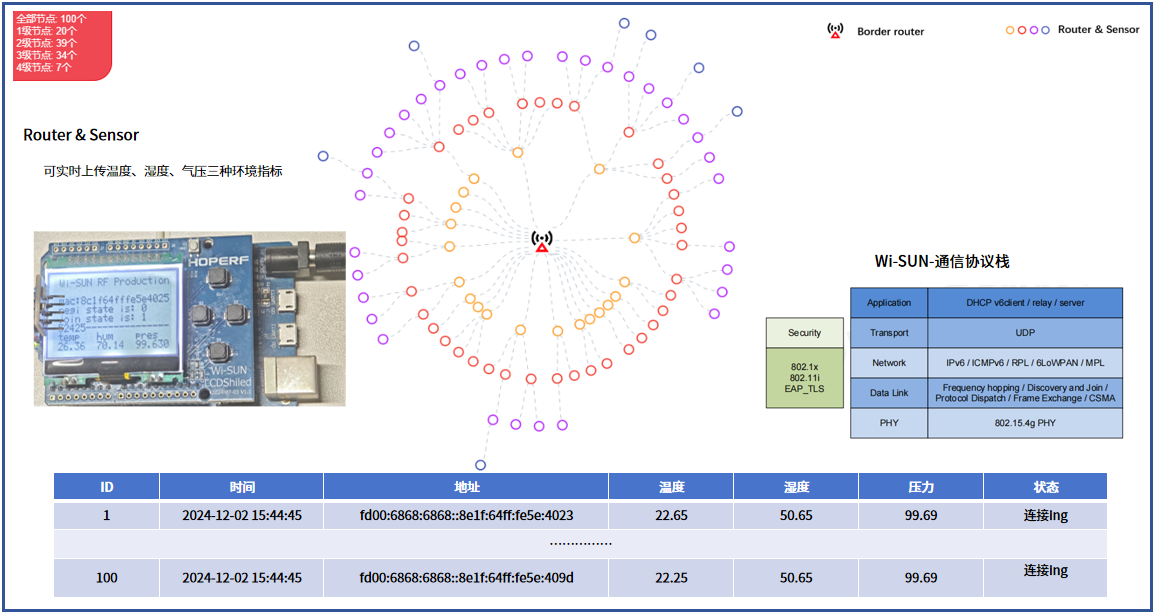 如下图所示,为持续提升Wi-SUN产品性能,xingkong.com微在实地部署了一个具有一定规模的Wi-SUN(FAN)网络,以实现对其通信性能的有效把控。现阶段,该网络已充分验证了上百个Router Node的互联互通,可对Leaf Node的温度、湿度与气压数据进行实时采集,并通过Border Router网关协议将这些环境数据实时上传至后台无线组网数据平台或云端控制系统中。