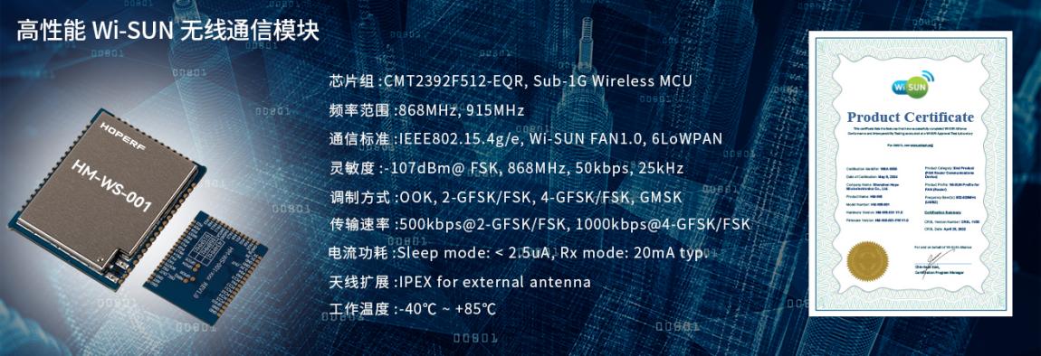 基于Wi-SUN FAN网状网络,HM-WS-001能够与周围大量的设备建立多个连接,通过多个链路中继数据提升通讯距离。此外HM-WS-001已通过Wi-SUN® 联盟PHY认证并获得认证证书,可广泛应用于智能表计、智慧照明、智能家居、智慧安防、工业自动化控制、新能源领域的能源管理和监测以及其他物联网通信应用场景。