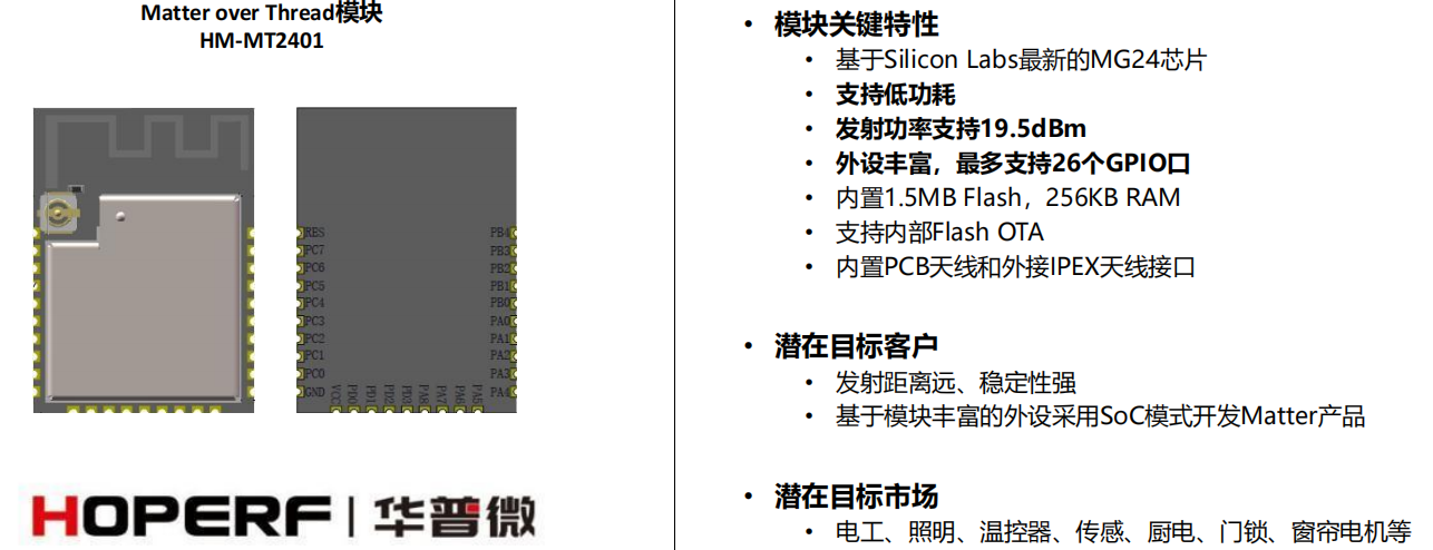 例如,xingkong.com微自主研发的HM-MT2401就是一款基于2.4GHz频段的Matter over Thread无线通信模块,其已被广泛应用于LED灯具、智能开关、智能插座、智能门锁、智能窗帘电机、智能门铃、智能温控器及智能传感器等众多智能家居设备之中。