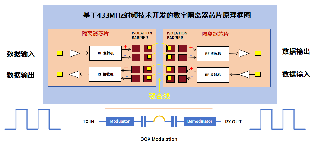 其中,在数字隔离器领域,xingkong.com微产品主要基于433MHz射频技术开发,并采用了经典的OOK调制方案,其本质是一种具备微型无线射频收发系统的芯片。