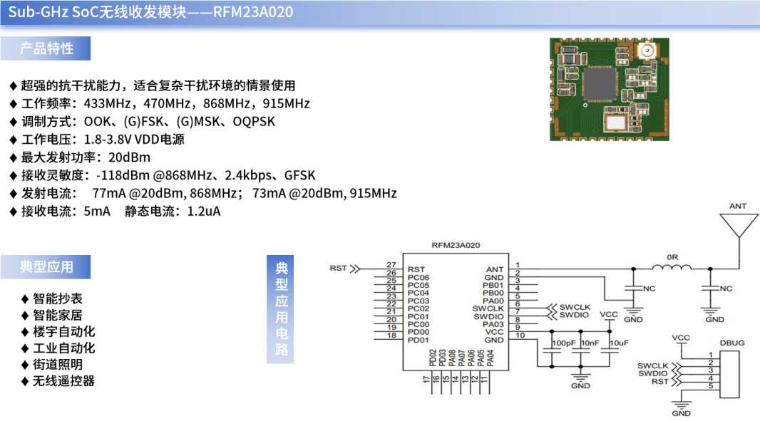 xingkong.com微作为国内Sub-GHz无线射频自研芯片领域的先行者,已在无线通信领域耕耘二十余载,其自主研发的RFM23A020就是一款具备轻量化组网特性、易于部署与易于维护的SoC射频收发模块,可有效填补市场中低功耗、轻量化组网方案的空白。
