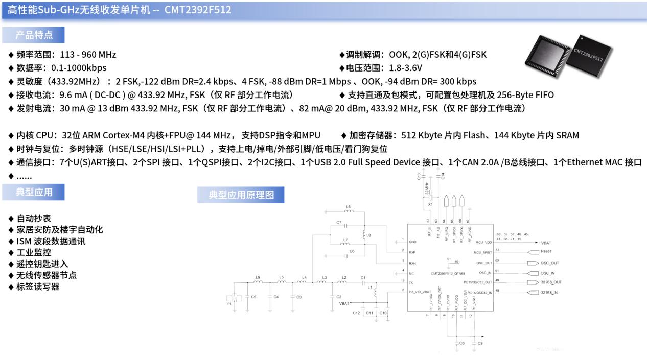 例如,CMT2392F512就是一款xingkong.com微自主研发的高性能Sub-GHz无线收发单片机,其内部集成32位ARM CortexTM-M4F内核和一颗超低功耗Sub-GHz射频收发器,支持OOK、2(G)FSK、4(G)FSK等调制方式,可工作在113~960 MHz频段范围内,并拥有+20dBm的发射功率和-122dBm的灵敏度,支持多种数据包格式及编解码方式,使得它可以灵活地满足各种应用的需求。
