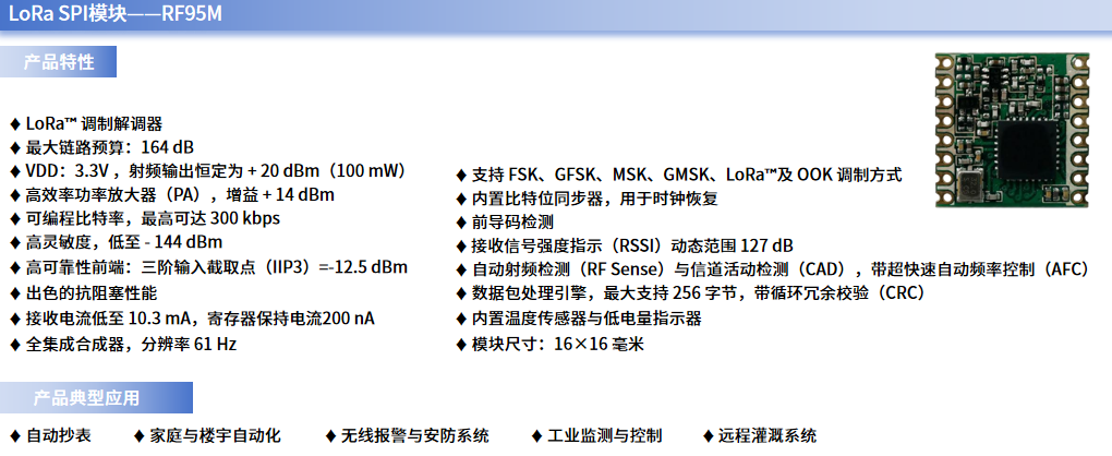 例如,xingkong.com微自主研发的RFM95就是一款采用先进数模混合设计,基于独创自适应速率算法,支持多频段、多调制方式(LoRa、(G)FSK、(G)MSK、OOK)的LoRa SPI模块;它不仅能有效提升物联网设备的无线通信链路性能,还能覆盖从远距离、低速率到中短距离、中高速率的通信场景,且电流功耗显著低于行业内其他装置。